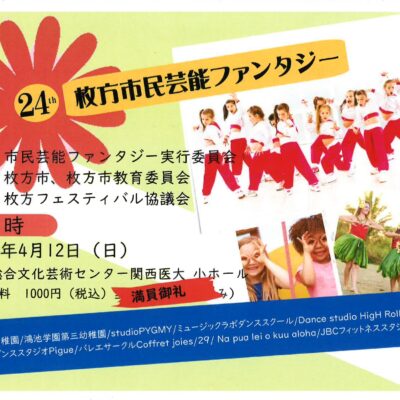 | まつり詳細 | 「枚方市民芸能ファンタジー」は、地域で活動する市民の皆さまが日頃の練習の成果を披露する舞台イベントです。 本イベントは、市民の文化活動の発表の場として開催されており、地域の文化芸術の振興と市民交流の促進を目的としています。舞台を通して、出演者と来場者がともに文化の楽しさを共有できる、市民参加型のイベントです。 ご家族やご友人とともに、地域で活動する皆さまの魅力あふれるステージをぜひご覧ください。 |
